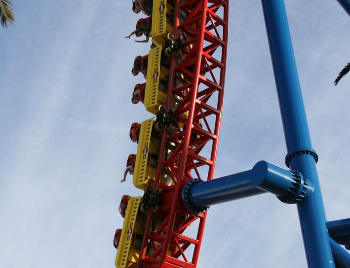The ride is packed into a tight spot. What this means is the elements are very small. Because of the tight radius of the top hat, you creep over the top very slowly, yet this is still enough to throw you out of your seat. Next up is the near-vertical drop into a tightly banked turn. Again because of the size constraints, this tight turn results in some incredible sustains positive Gs.