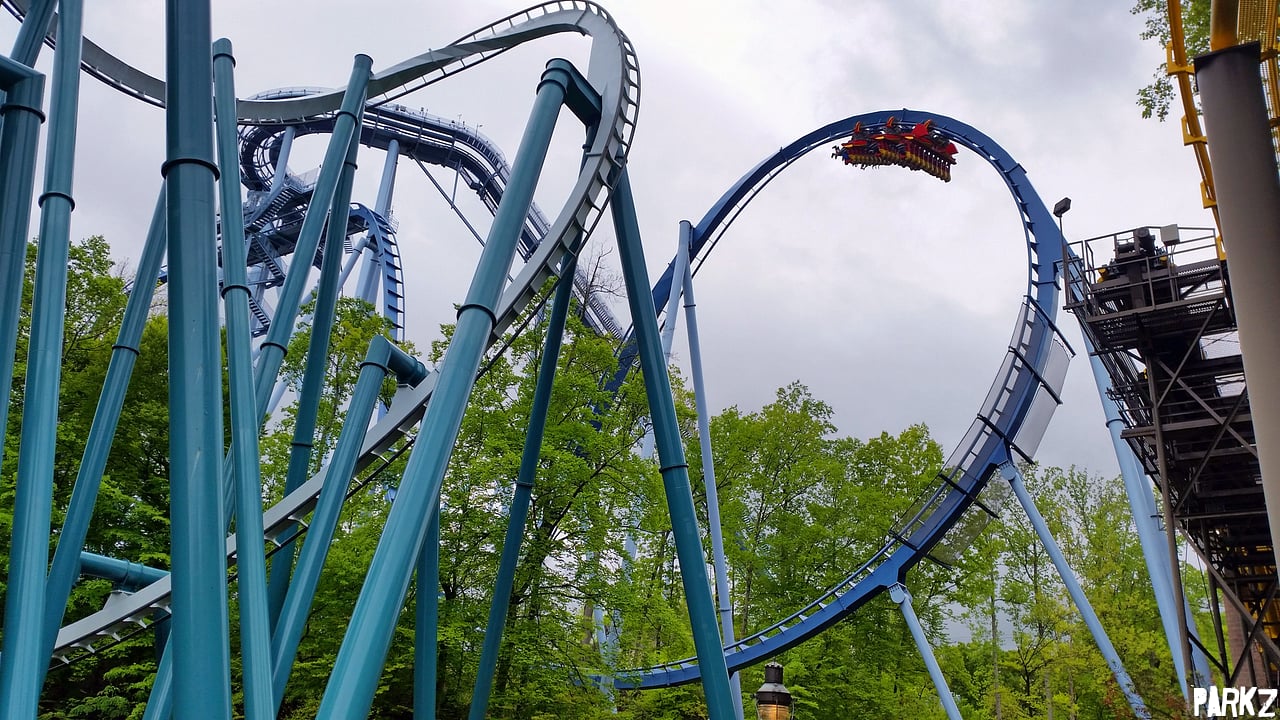 2007's Griffon is the park's third and most recent B&M coaster, this time a dive coaster. With 10-across floorless cars, Griffon uses sheer magnitude for psychological torture; it's easy to feel like helpless when you're amongst a row of 10 and facing a 60m vertical drop. The ride features two inversions, both immelmanns.