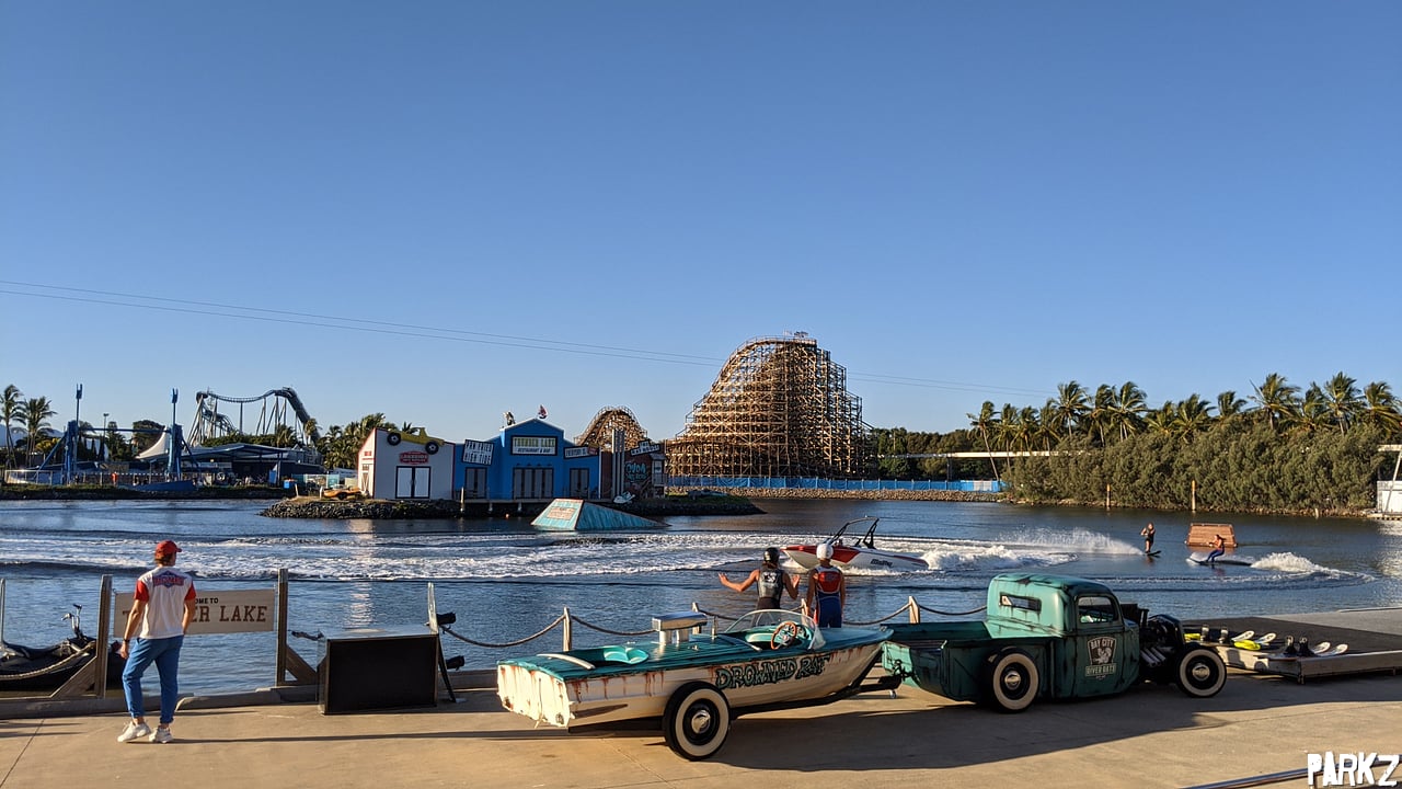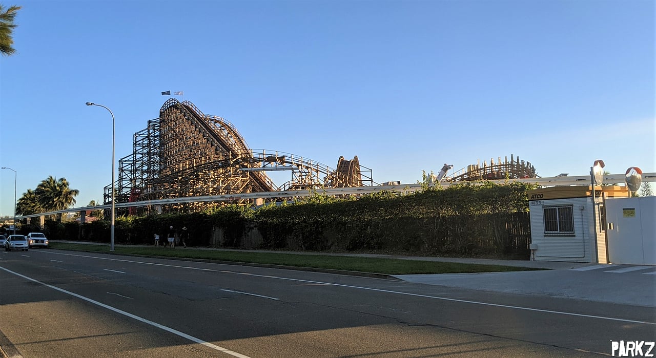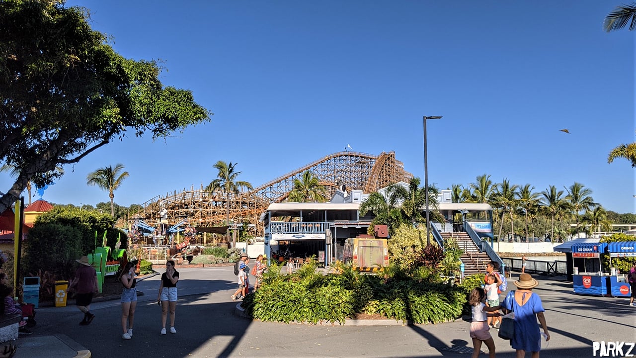 From the Nickelodeon Land, it's apparent just how nice the timber of the ride looks against the surrounding vegetation. Relatively few wooden coasters exist in subtropical climates, so there is a real opportunity here for Sea World to really continue the landscape and create one of the best looking wooden coasters out there.
