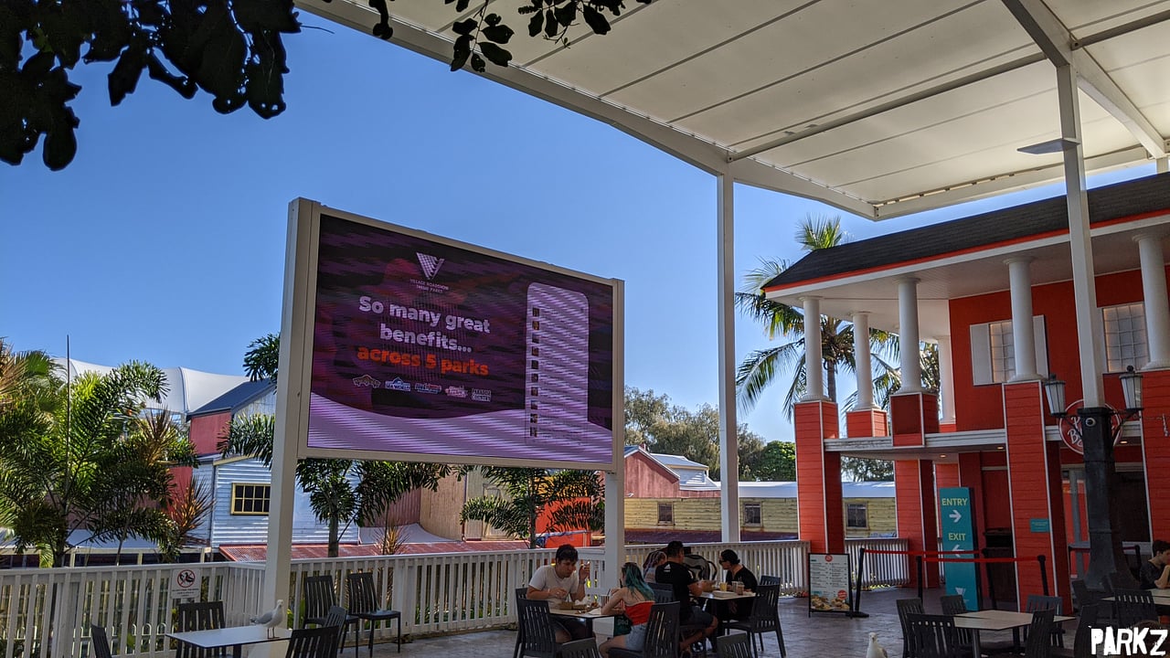 A new big screen in the Plaza area. Because this area doesn't get used for many live shows, nor is there a collection of Warner Bros. cartoons to lean on here, it ends up showing advertising most of the time.
