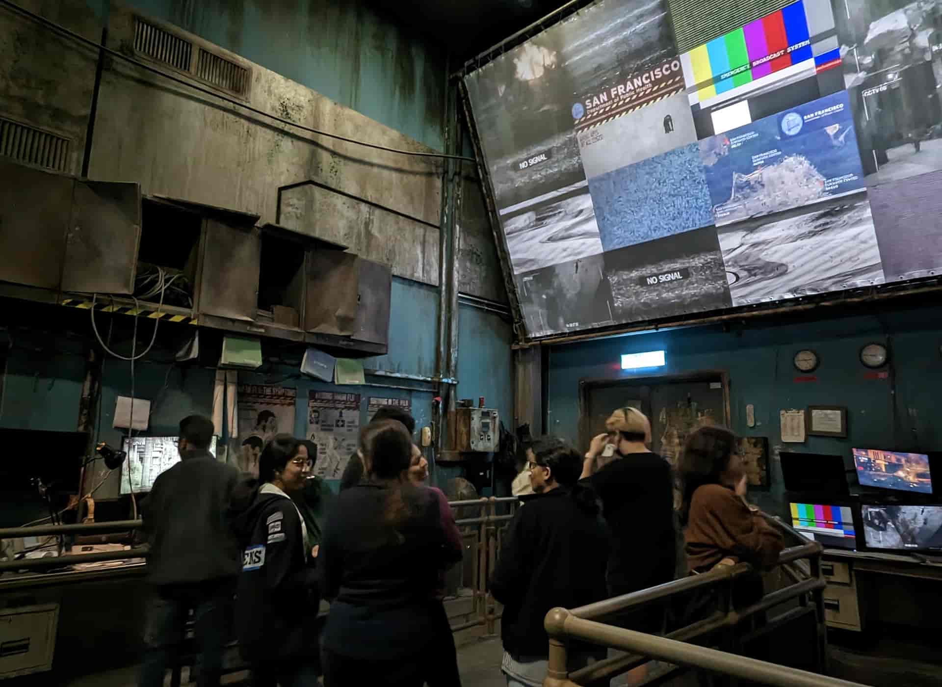 The vehicles travel from scene to scene, through a combination of physical sets and past projection screens.