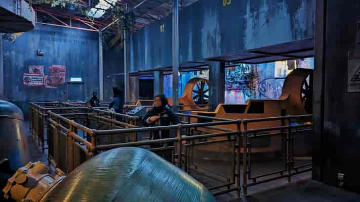 Guests ride in trackless vehicles equipped with motion bases whilst wearing 3D glasses.