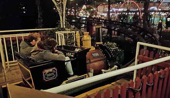 Powered mine train coaster, built above the walkways and buildings of the southern corner of the park.