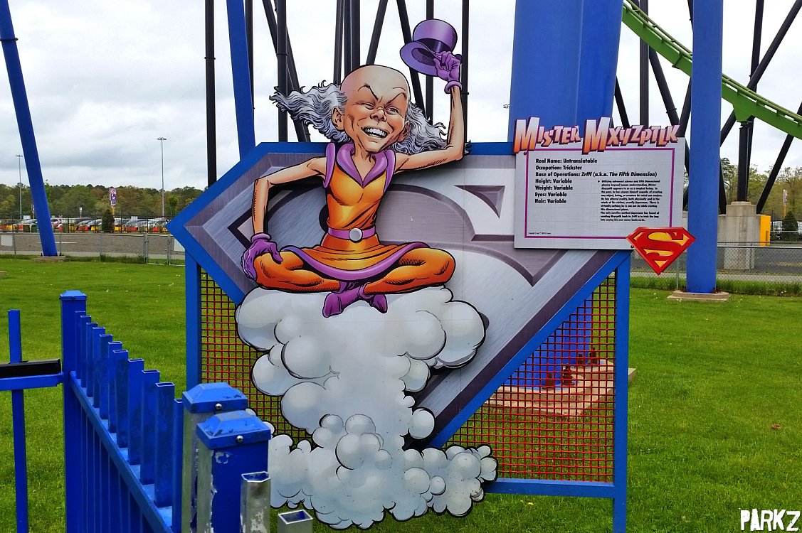 The queue winds around the grass under the ride, with a few info boards about Superman universe characters.....Mr Mxyzptlk?