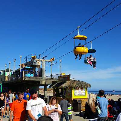 Sky Glider passing the buildings of the Looff Carousel, Speed Bump dodgem cars, and the Haunted Castle.