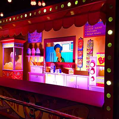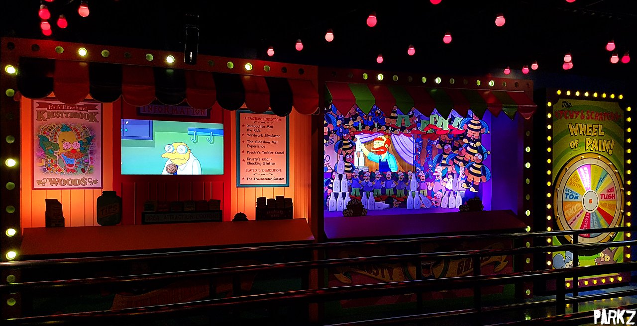 The queue for the ride is indoors amongst the Krustyland sideshows.