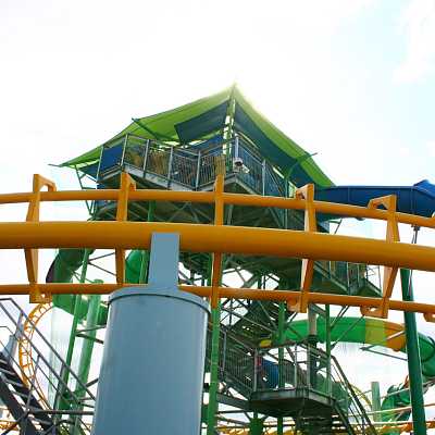 The tower is located within Cyclone's helix and each of the three slides wrap extensively around the coaster for some added thrills.