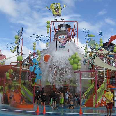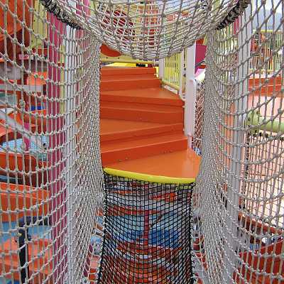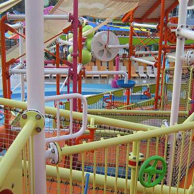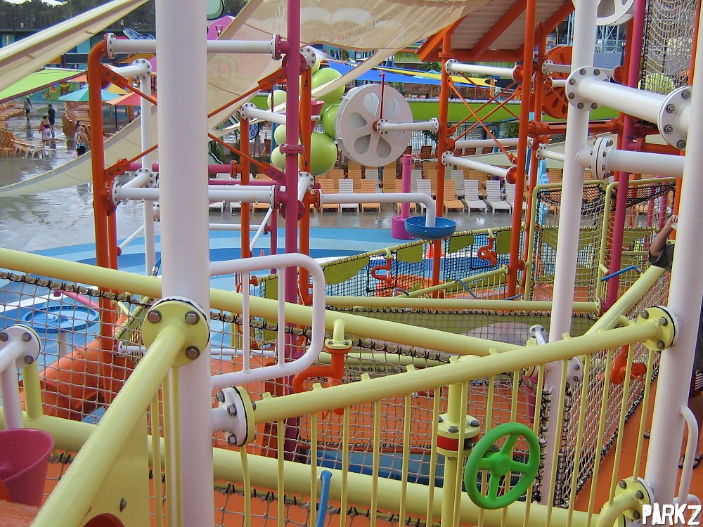 The structure is a complex network of pipes, walkways and water toys.