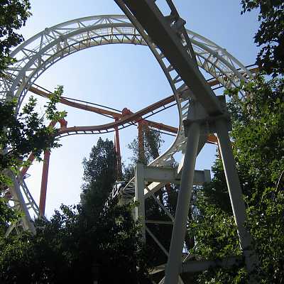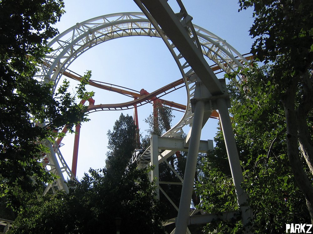 The worlds first steel coaster vertical loop, with Tatsu in the background.