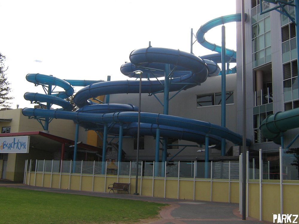 The slides run outside the building, but with the starting tubs and runout chutes indoors, making them an all weather attraction.