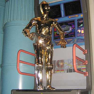 A damaged StarSpeeder 3000 craft is positioned in the queue. The ride itself takes place in a simulator pod themed to the same type of craft.