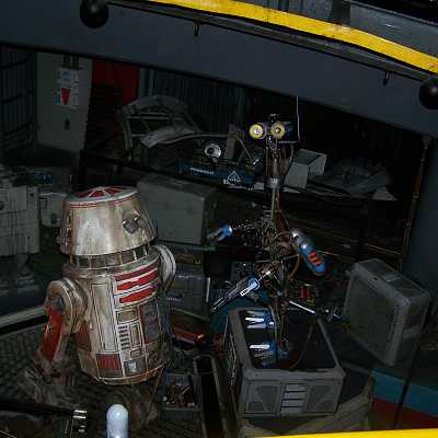 A damaged StarSpeeder 3000 craft is positioned in the queue. The ride itself takes place in a simulator pod themed to the same type of craft.