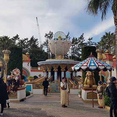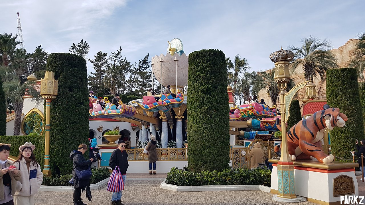 The ride is a highly themed "Dumbo" style spinning ride, with the carpets rising up and down as the ride spins.