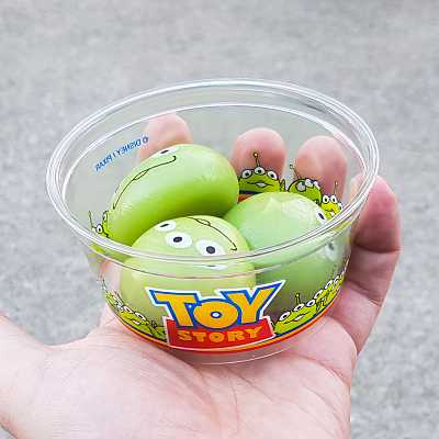 Green alien mochi balls, containing strawberry, chocolate and custard cream.
