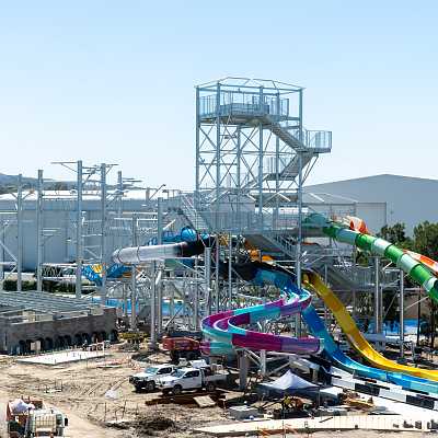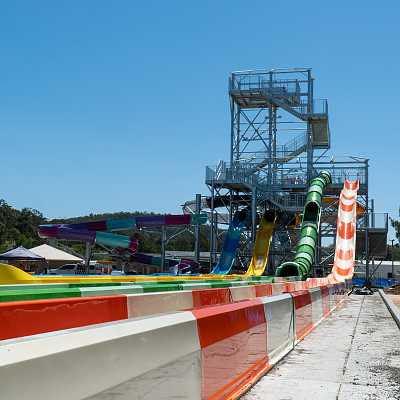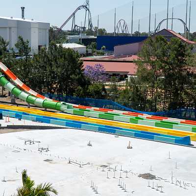 These slides start with a couple of enclosed turns with rainbow light effects, followed by some open air turns. You can race your friend, though the speed is highly variable depending on how you lay.
