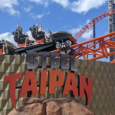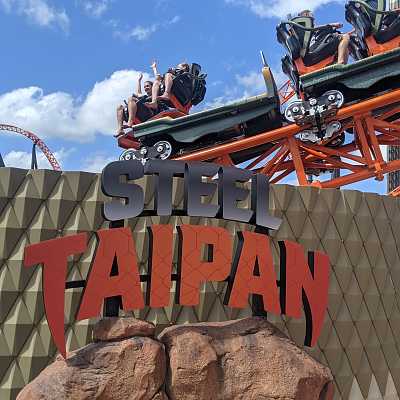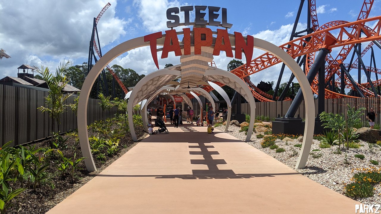 The entrance path, with a modern shade structure inspired by the skeleton of a snake.