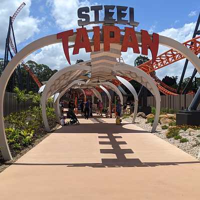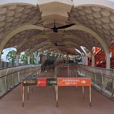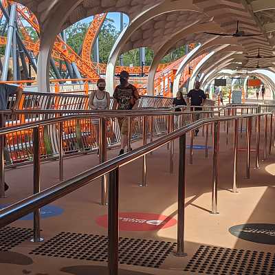 The queue splits, with general riders heading up to the right, with Single Riders, Ride Express pass holders and Tailwhip riders heading up the left.