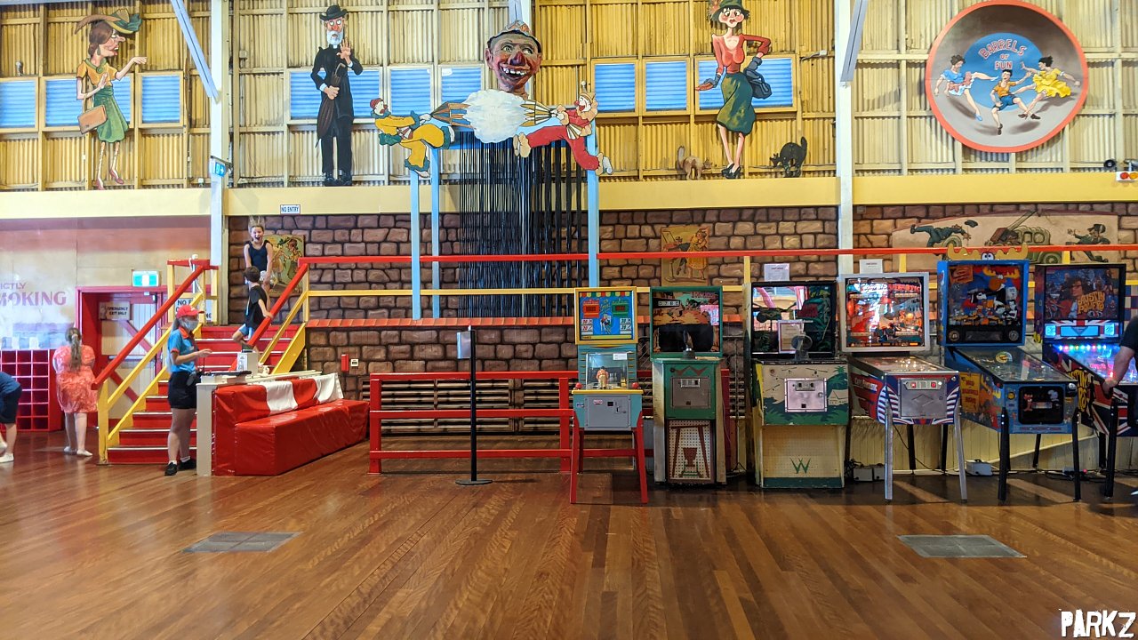 On the walkway behind you can squeeze through some elastic strings. In front is a great collection of retro arcade machines.