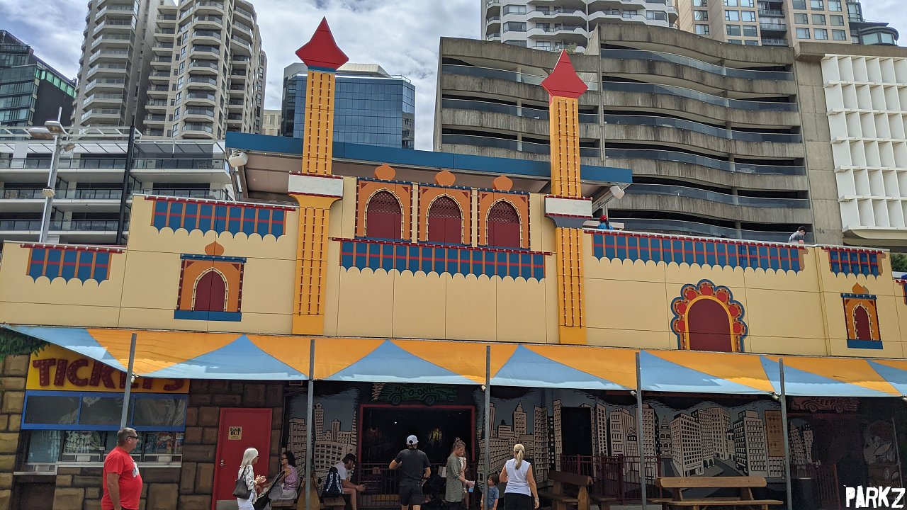 The station is low key, behind this façade above the dodgems.
