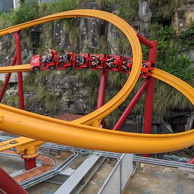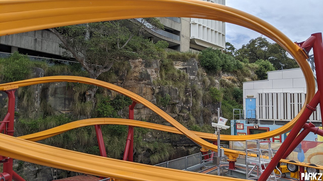The helix transitions into inversion #2, a corkscrew, with a nice bit of hangtime at the top.