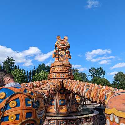 What makes this fun is a bouncing soundtrack and water spitting statues around the perimeter. The song tells you if you need to move up or down to avoid the water jets.