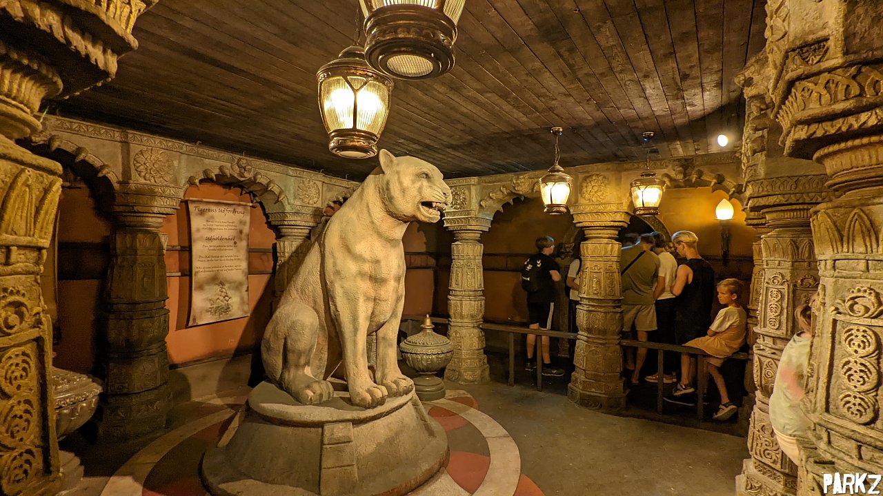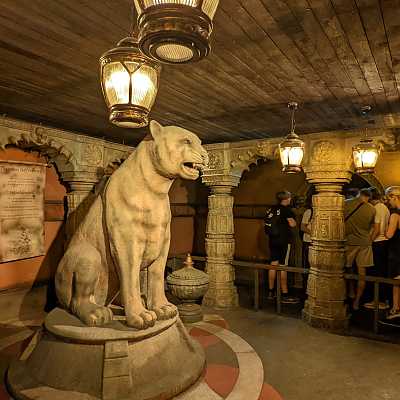 The queue is unusual in that it doesn't really afford riders view of the attraction in action. Instead it routes through an elaborate underground temple.