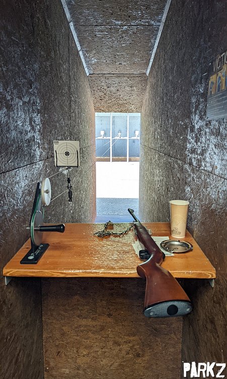 Guests are issued with a plate of slugs and a paper target you wind out to the appropriate distance. The gun is chained to the bench so you cannot point it the wrong way.