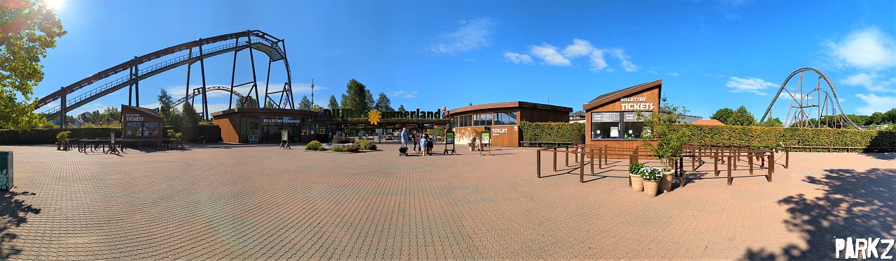 A panorama of the entry plaza, framed by DrageKongen and Piraten.