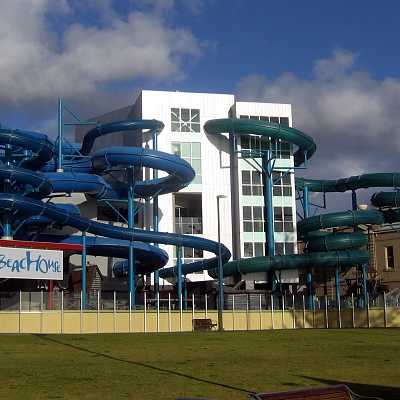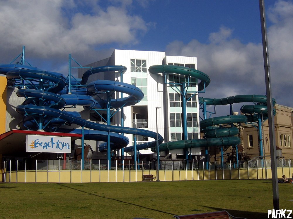 The entire side of the complex that faces the beach is dominated by a tangle of water slides.