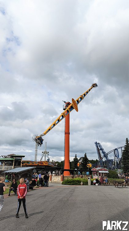 Guests ride in flipping seats at the end of a huge rotating boom.