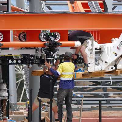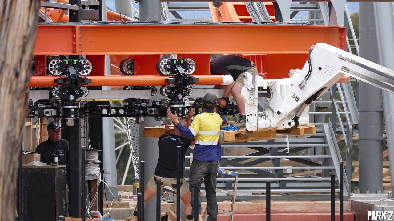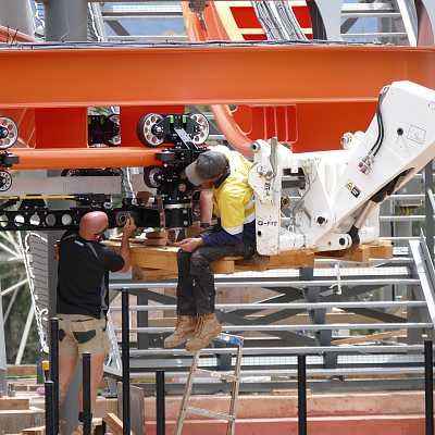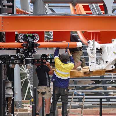 How to install a Vekoma SFC wheel bogie 101. Step (6): Turn on tire drives to move wheel bogie assembly further into station.