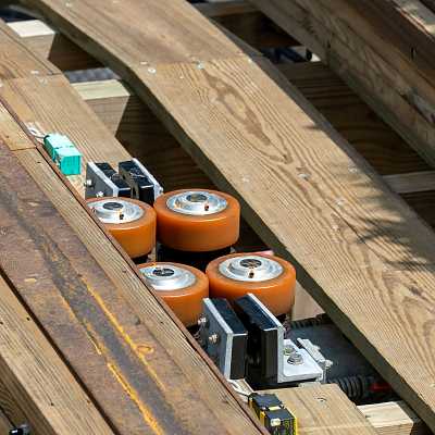 The switch track for the maintenance shed. The curved steel rail in the middle rotates to change the track direction when they need to add or remove trains from the main course.