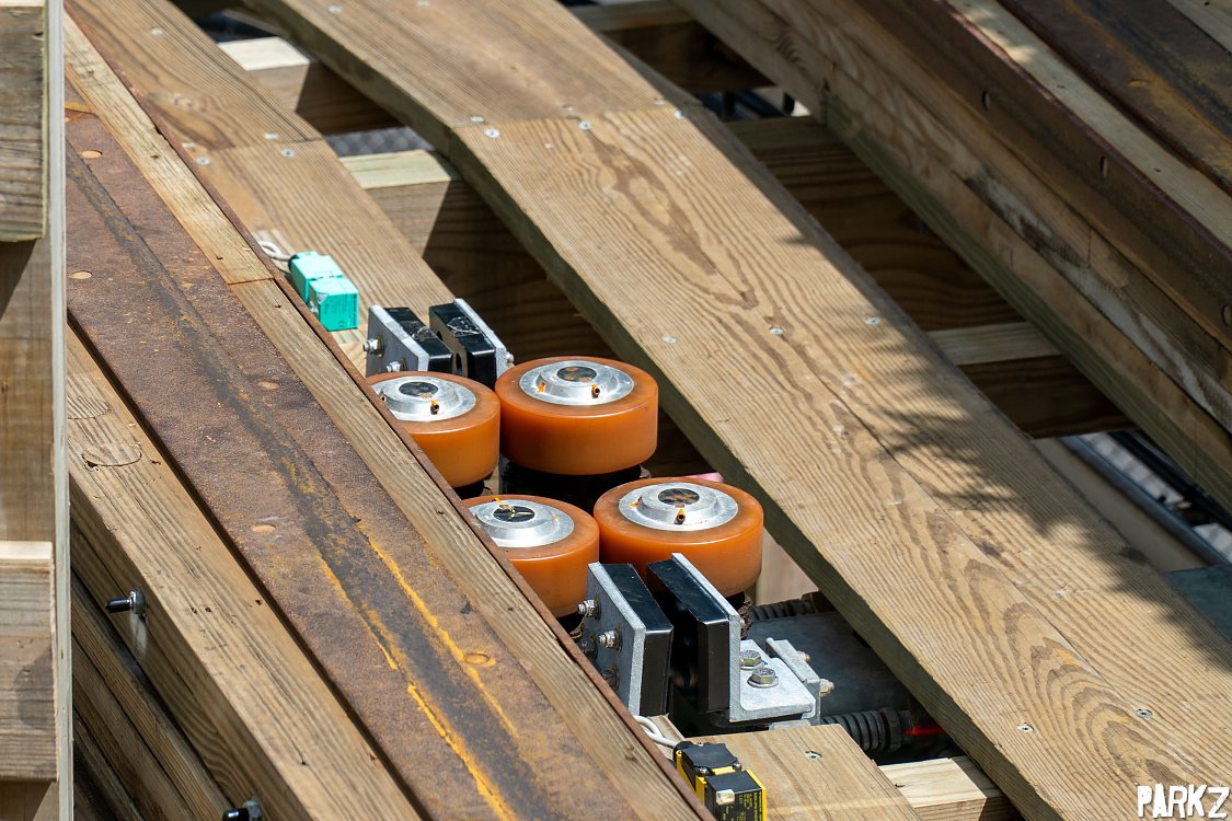 Friction wheels that move the stationary train from the brake run into the station for unloading.