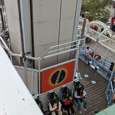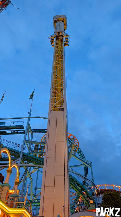 It combines the ride motions of a Space Shot and a Turbo Drop. You are launched to the top of the tower (rather than a slow ascent) held at the top, and then launched back towards the ground, followed by several up and down bounces.
