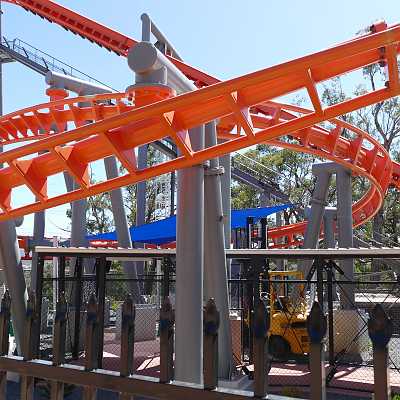 The queue passes through an "island" in the middle of the helix, allowing guests to watch trains thunder around them as they wait.