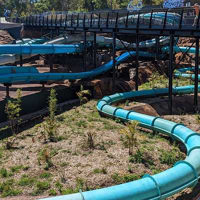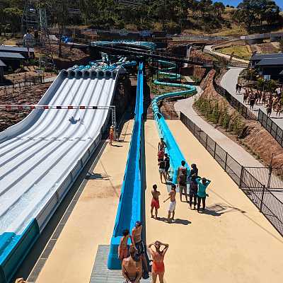 Two slides constitute The Stinger. Singer Twist starts of with a helix, and then proceeds to snake down the hill. Stinger Bump is more like a traditional speed slide, with dips in a straight line.