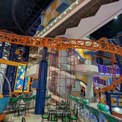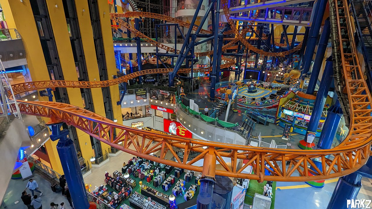 There are further turns as the track loops around to the lift hill. Check out those supports hanging off the building lifts.