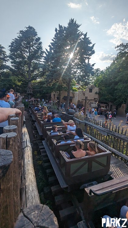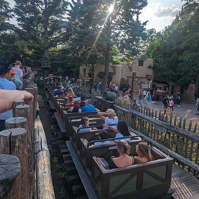The ride rises back up on the other side. Instead of a brake run, there is a lift hill the train mostly coasts to the top of, before it catches and brings the train to station level.