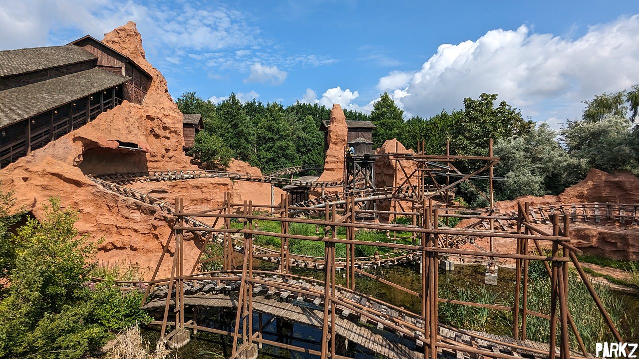Calamity Mine is a mine train coaster featuring dual lift hills.