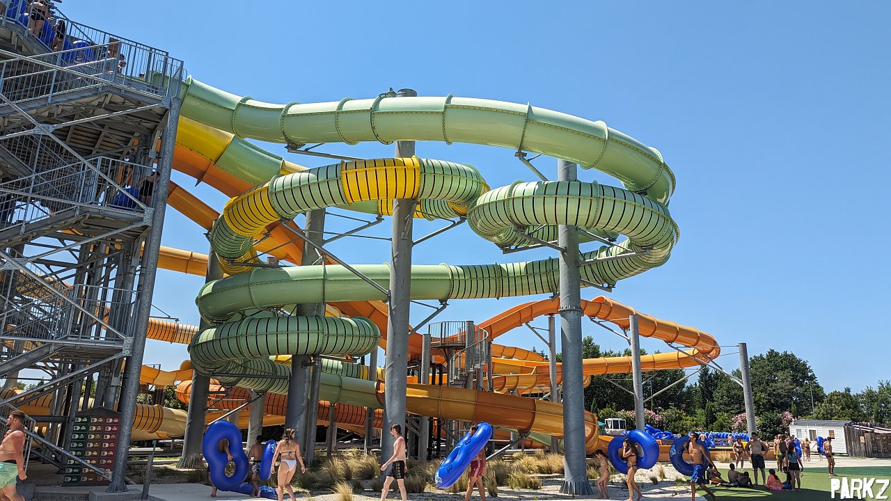 Rainbow Race (green) and Le Psychédélik (green and yellow) are enclosed tube slides with transparent ring lighting effects.