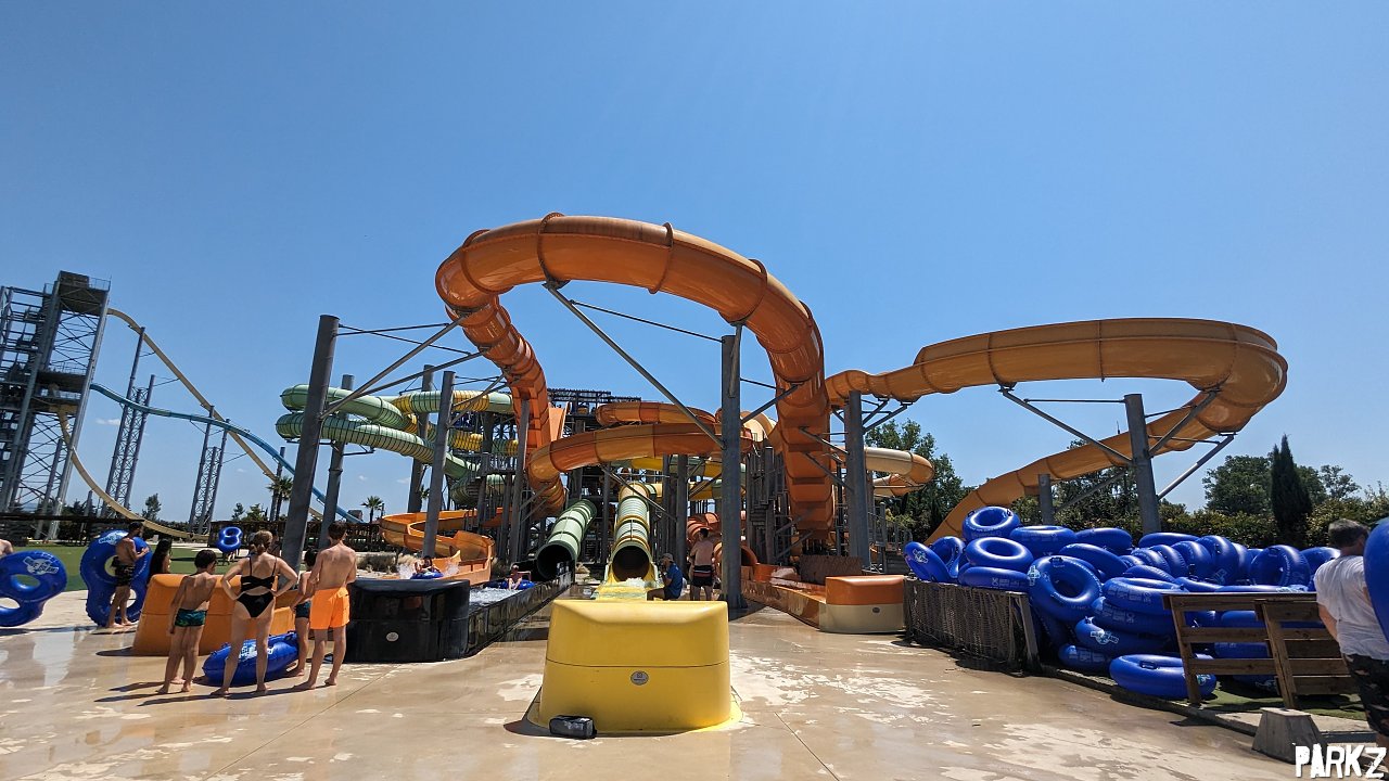 Le Tortuga (Dark and light orange stripes) is a conventional downhill open air raft slide, weaving under the others.