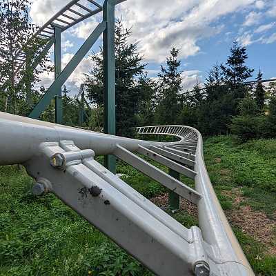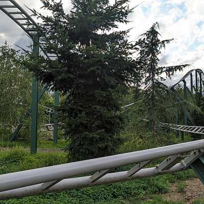 Dropping into the final turn. Notice too how in Europe rides often don't have heavy fences. Guests tend not to actively enter danger zones.