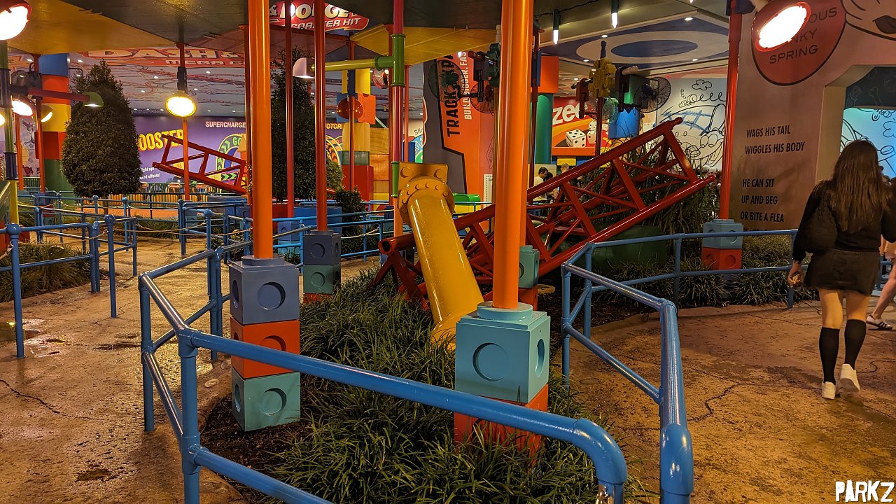 Spare pieces of track and supports are throughout the queue.