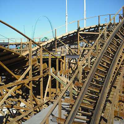 One of the newer signature features of GCI coasters is a "station fly-through", where the train passes back through the station building at an elevated height, providing a 'headchopper' effect for riders, and a bit of visual interest for those waiting to board at the platform below.