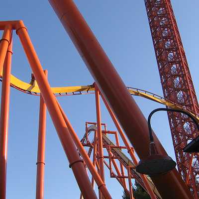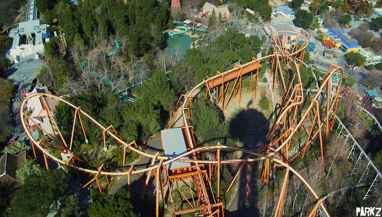 Here you can see one of Magic Mountains newest attractions soaring over one of its classics.