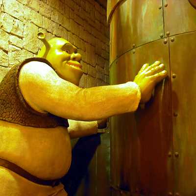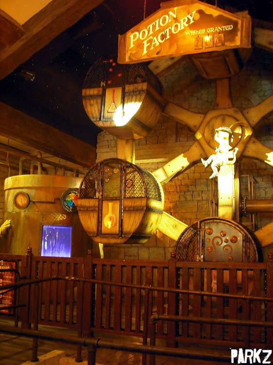 The exits of both Shrek 4D and Donkey, Live! flush out into Fairy Godmothers Potion Shop, which contains Magic Potion Spin, a kids ferris wheel.
