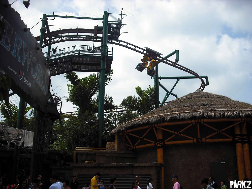 Canopy Flyer is a seldom seen coaster type, a "Swing Thing" coaster built by Setpoint. Cars hang below the track and can swing from side to side, and backwards and fowards.
