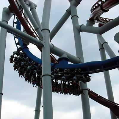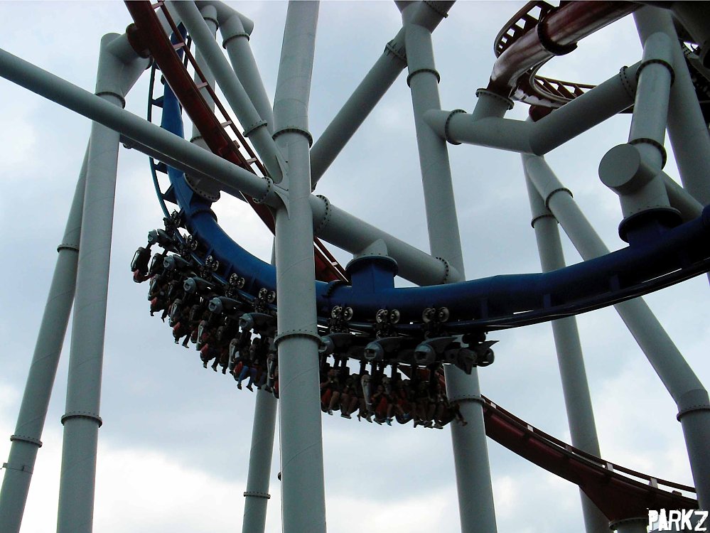 The Cylon track is a blue inverted roller coaster with 5 inversions.