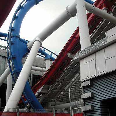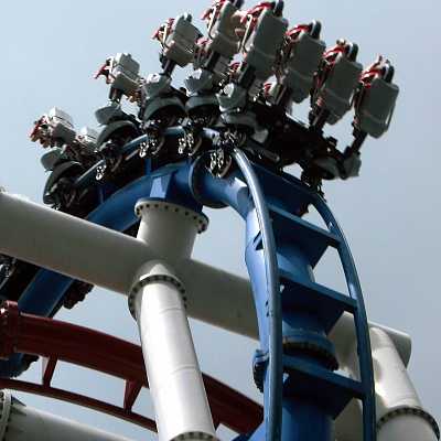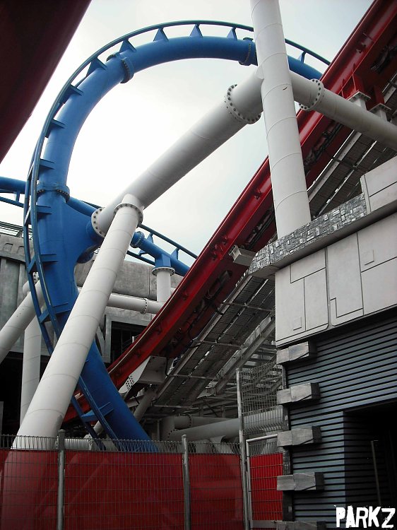 The base of the loop is set in a fog filled concrete trench, and the train hits top speed down there.