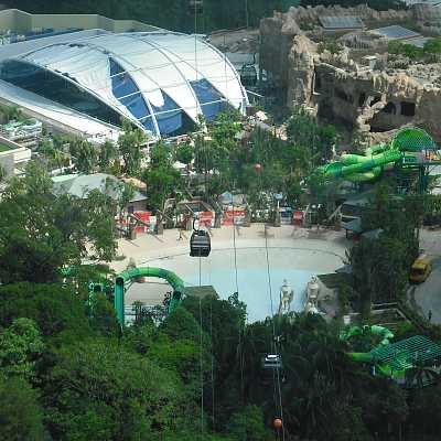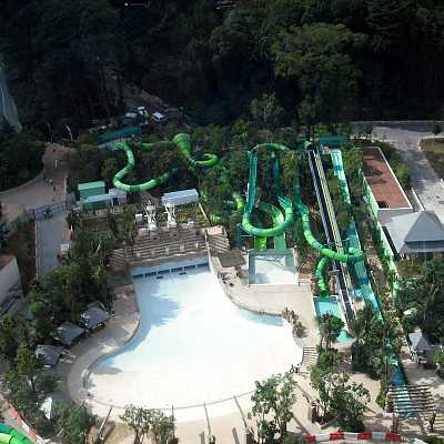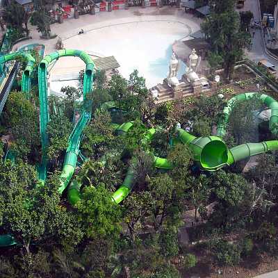 At the back of the park on the hill (From left to right) you will find a conventional raft slide, a 'Topsy Turvy' slide, a 'Hydromagnetic' slide featuring uphill sections, and a 2 lane mat racer.